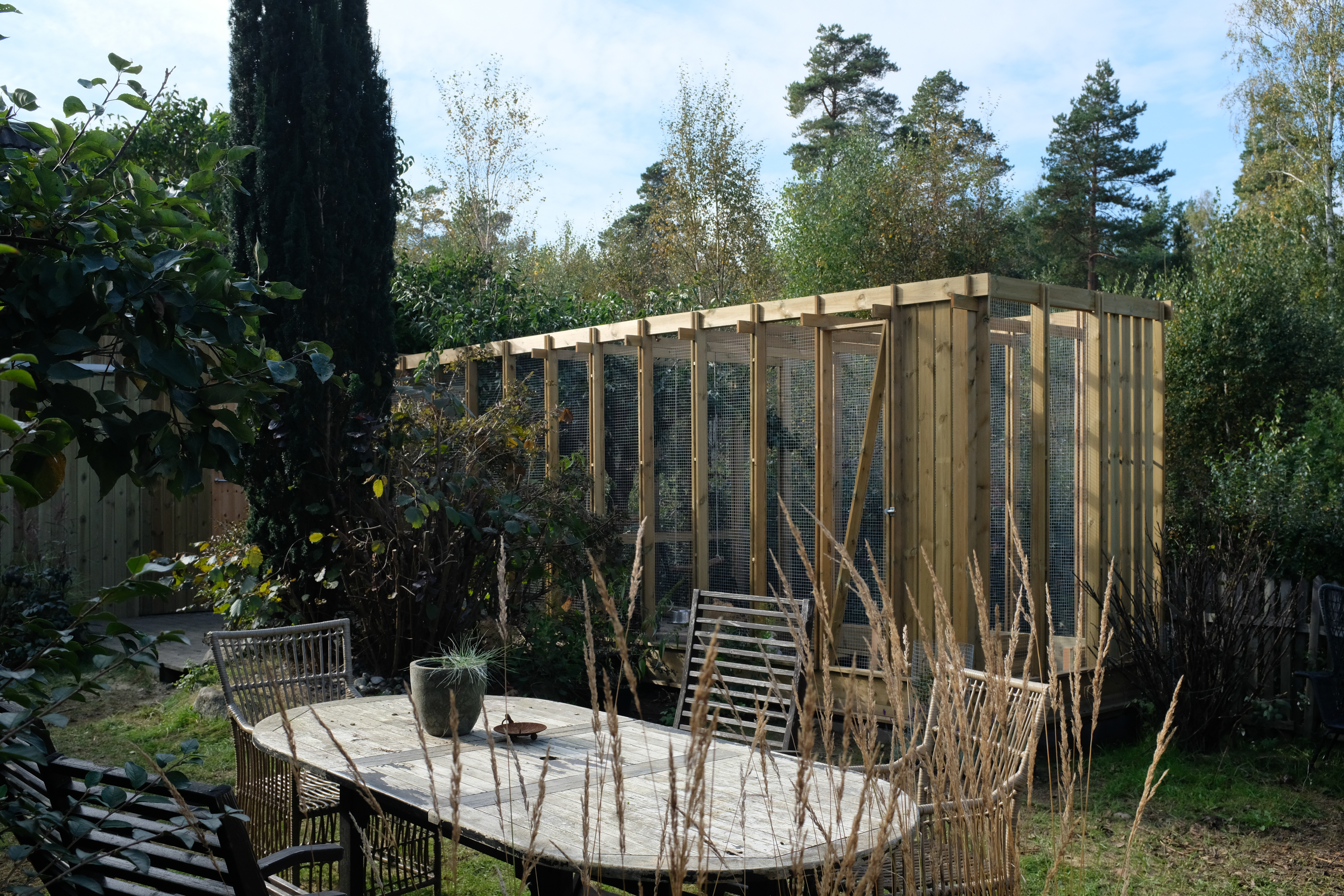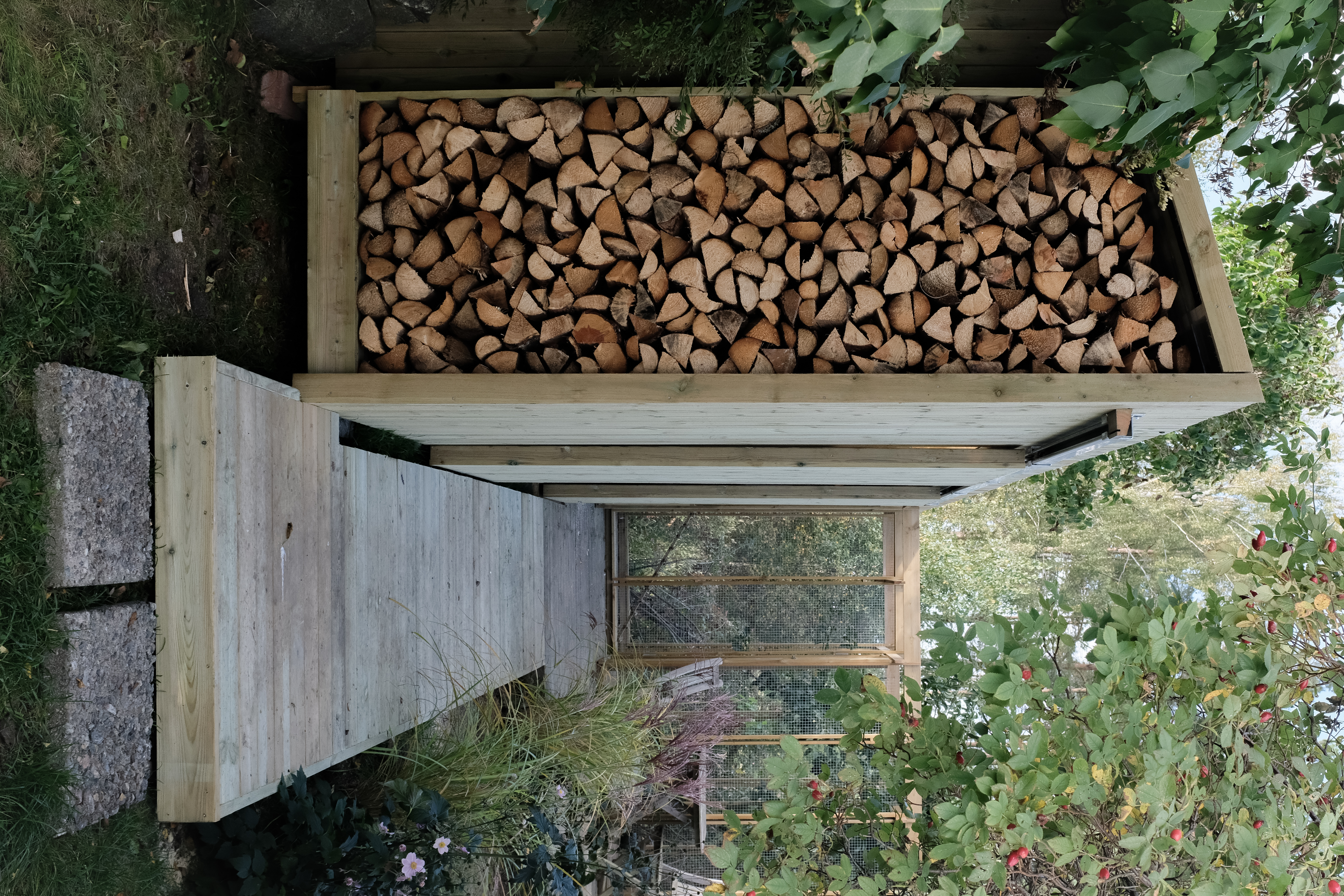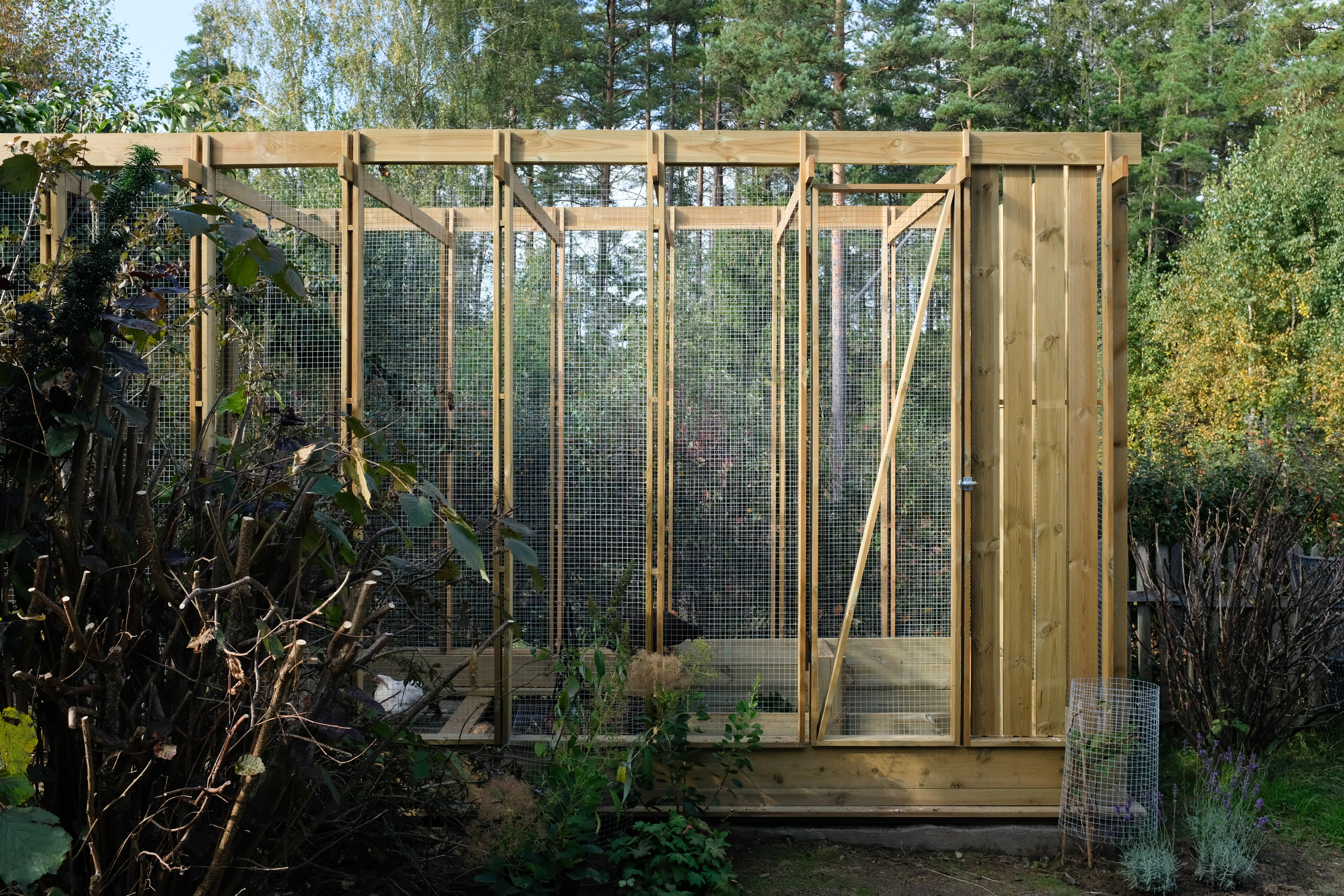 The structure uses rough-sawn Norwegian spruce, left to weather naturally, jointed with traditional mortise-and-tenon connections wherever the chickens' wellbeing and a few wood screws would allow. The roof pitches in two directions to shed snow, and a south-facing run gives the birds light in the few hours of Oslo winter sun.