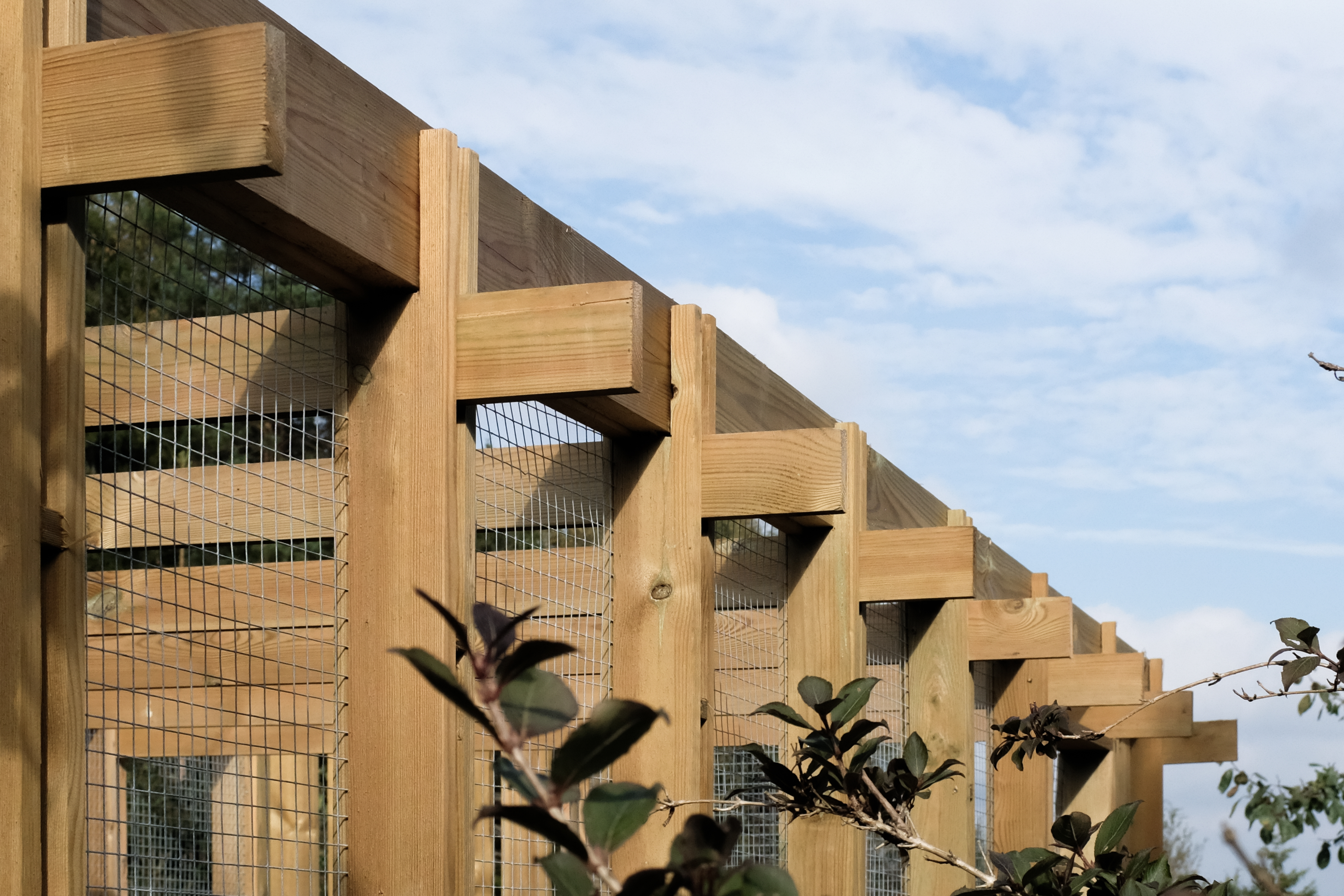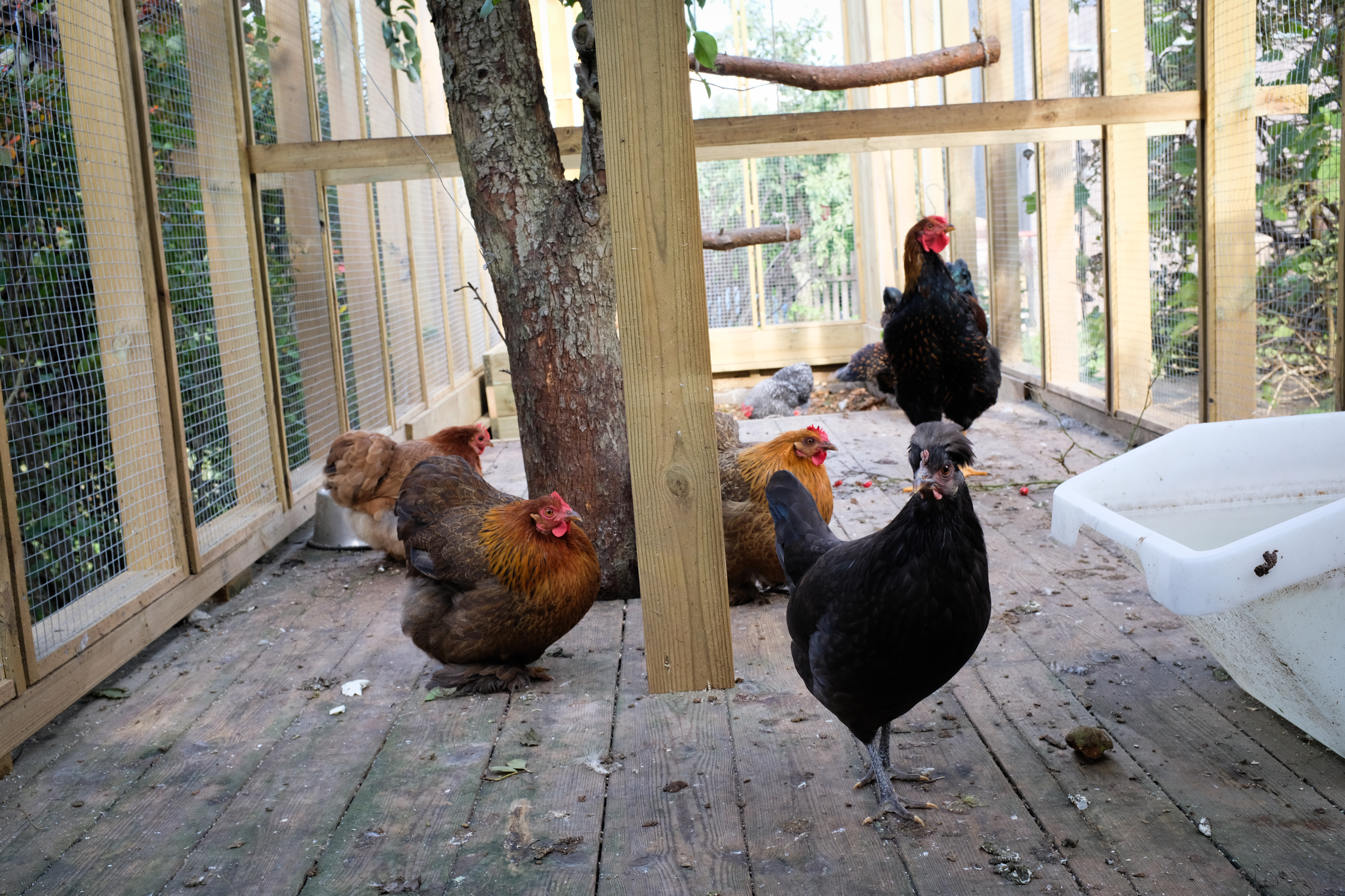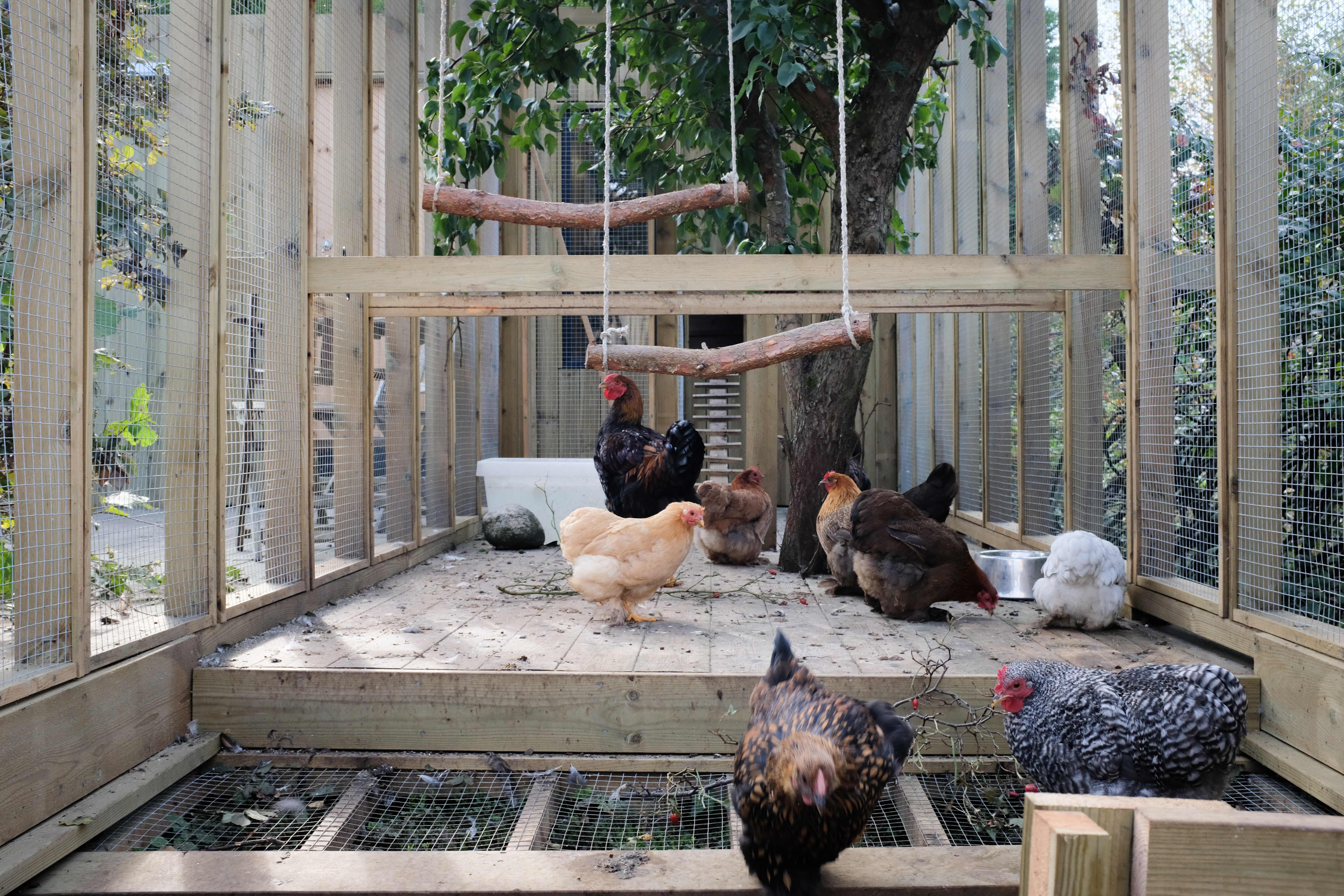 Strukturen bruker grovt saget norsk gran, overlatt til å brune naturlig, med tradisjonelle tap-og-splitt-forbindelser der hønenes velvære og noen treskruer tillot det. Taket skråner i to retninger for å avlede snø, og en sørorientert utegård gir fuglene lys i de få timene med Oslo-vinterlys.